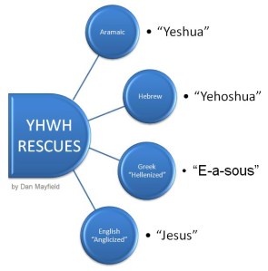According to Matthew, Jesus came to save people. It was stated in his name. According to Matthew 1:21, He was called Jesus “for He will save His people from their sins.” As the graphic depicts, “Jesus” is the Anglicized form of the Greek name “E-A-sous”, which was the Hellenized form of the Hebrew “Yehoshua” (“Joshau” or “Yahweh rescues”), which was the same as the Aramaic “Yeshua”.