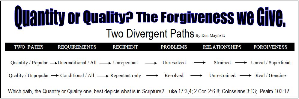 The graphic above is a way of showing the rightness of this path in contrast to the popular idea that we just forgive everyone, whether or not they repent, and whether or not they ask for forgiveness. The consequence of following the popular path is to create a church full of superficial relationships which makes it impossible for real Christian fellowship to occur. With the unrepentant being forgiven, allowed to continue on his way, relationships are strained and whatever forgiveness is given, is at best a superficial show and completely unlike the forgiveness God intended.