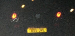 Driving through a town the other night in the UK, we saw a little sports car pass us by and the license plate caught our attention. We decided to keep up with the car in time for me to snap a photo. Trying to be stealthy and capture the image without being detected by the driver I forgot to turn off the flash. I got the photo but certainly not without the driver seeing the blinding light from the car in his rear view mirror.