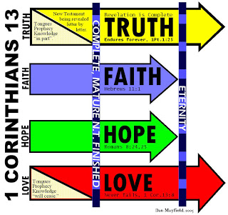 This is a graphical explanation of 1 Corinthians 13 to show when the things that are miraculous (tongues, knowledge, prophecy) will cease, and to show the things that will continue (i.e. Faith, hope, love, and truth).