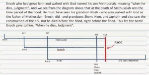 Enoch never knew Noah, but Noah surely knew Enoch through the teaching and example of Enoch’s son, Methuselah. Enoch was very righteous and known for walking with God. Interestingly it says that Noah walked with God, Gen 6:9. It’s interesting that Enoch named his son what he did, which means, “When he dies, Judgment”. And in fact, the dating lines up that the year of the flood is the year that Methuselah died.