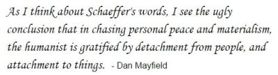 As I think about Schaeffer’s words, I see the ugly conclusion that in chasing personal peace and materialism, the humanist is gratified by detachment from people, and attachment to things. Is that not a sobering thought? It might answer why there is so much destruction of life in our humanistic world. Life has no meaning.