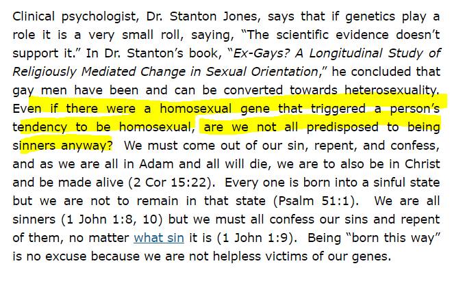 In the graphic is illustrated the problem of addressing the “born gay” idea because the article in question says there’s no proof there’s a gay or lesbian gene, not born that way in other words, but then the article repeats the lie that we are born with a predisposition to sin. The Calvinist “born depraved” teaching isn’t proven any more than being born gay is proven. But Calvinism weakens a valid argument against gayness by inserting their error.