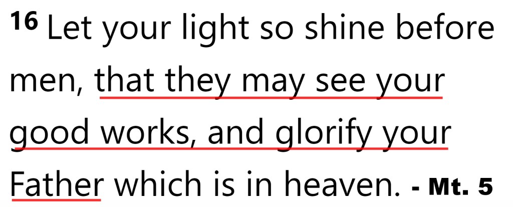 Literally, every day and every minute is the chance to be the best you can be to the glory of God. A lot of people go out in the workplace and suddenly they forget they are working for the Lord. Instead they gripe and complain and forget this is their chance to show the world that Christ’ followers are different. “Work at everything you do with all your heart. Work as if you were working for the Lord, not for human masters.” Col. 3:23. Let your eyes be clean. Let your hands be pure. Let your tongue be filled with grace. Be honest and fair to all. Don’t forget to love the Lord first, and your neighbor second. Be salt and light today. And do it so people glorify God, Mt 5.